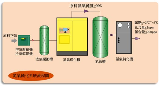 氮氣純化機是以一般氮氣為原料,經由加入氫產生化學反應而有除氧、吸附乾燥、再經過濾除氮氣中的雜質、水份、和塵埃之後可獲得高純度氮氣。